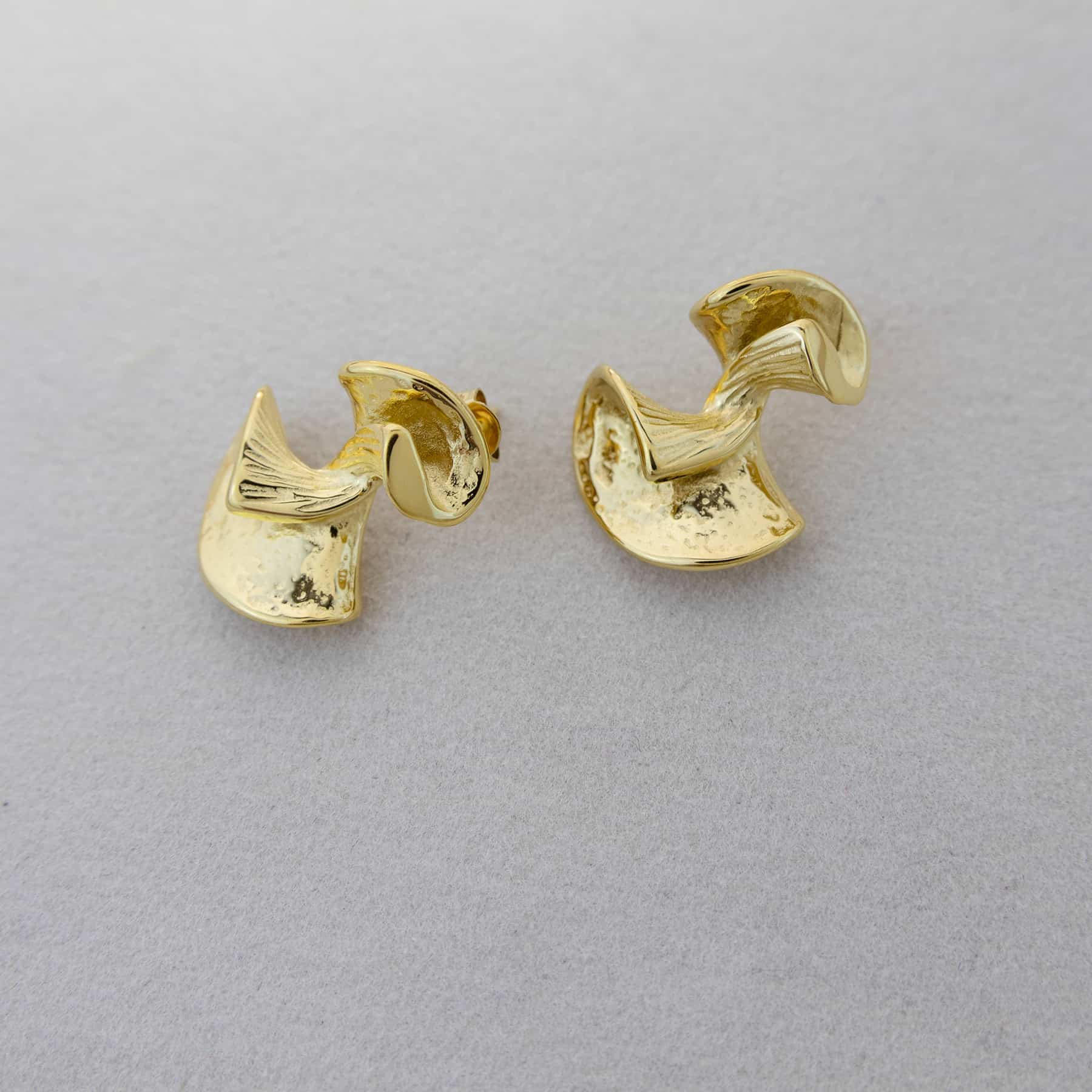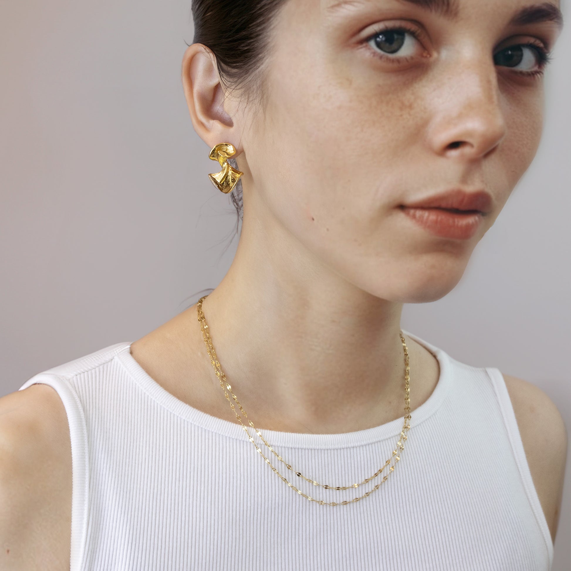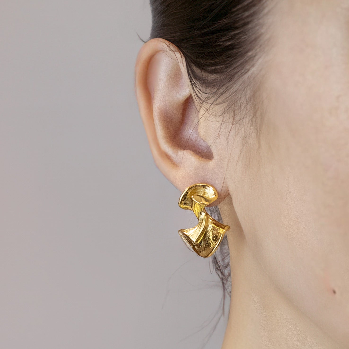 這款耳針靈感來自於優雅織物的扭摺細節,巧妙地將複雜的布料結構轉化為精緻的金屬工藝。每一個折痕都精確無比,展現出織物柔美流動的視覺感受。這種設計不僅呈現出紡織品的溫柔觸感,也象徵著在平凡中發現非凡的美學。佩戴這款耳針,無疑會為任何造型增添一抹精緻與現代的風格。