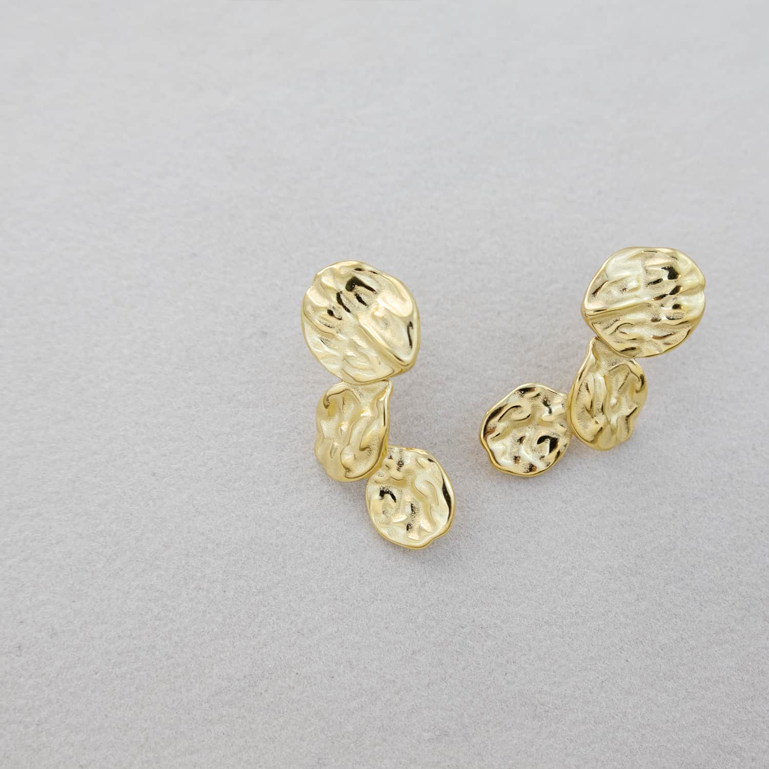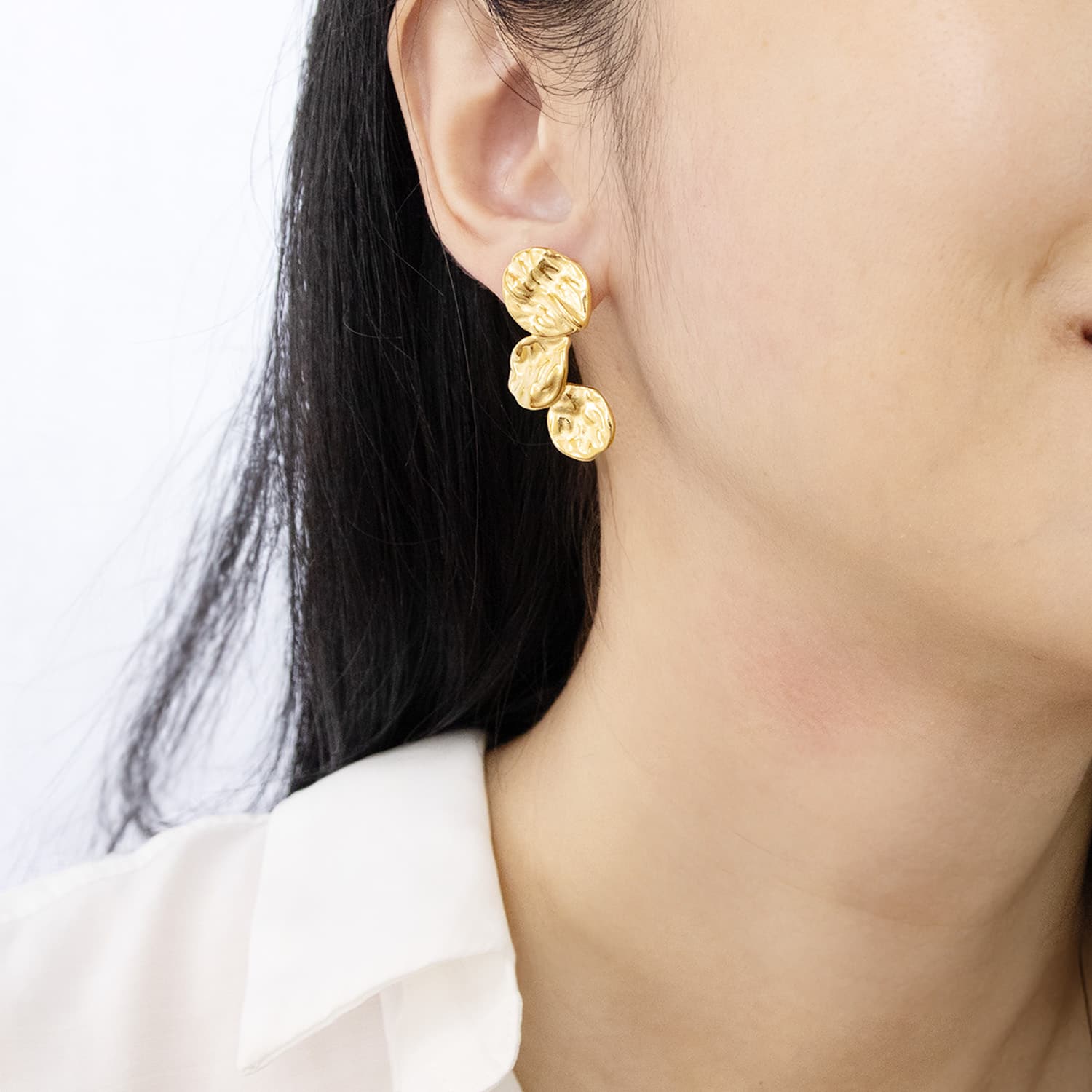 以立體捶印靈感結合精細工藝的精緻耳針,溫潤金色紋理,帶給金屬光影交織的閃耀,展示著不分年齡及場合的優雅序曲。