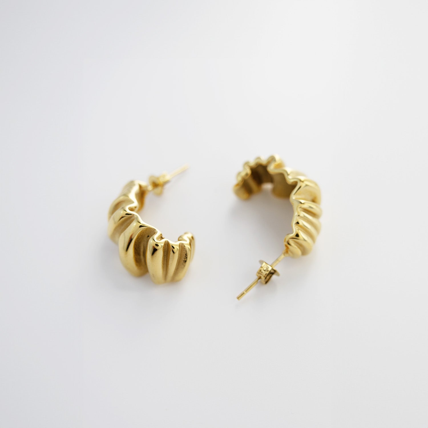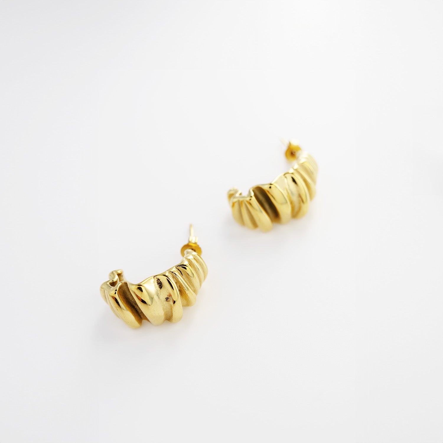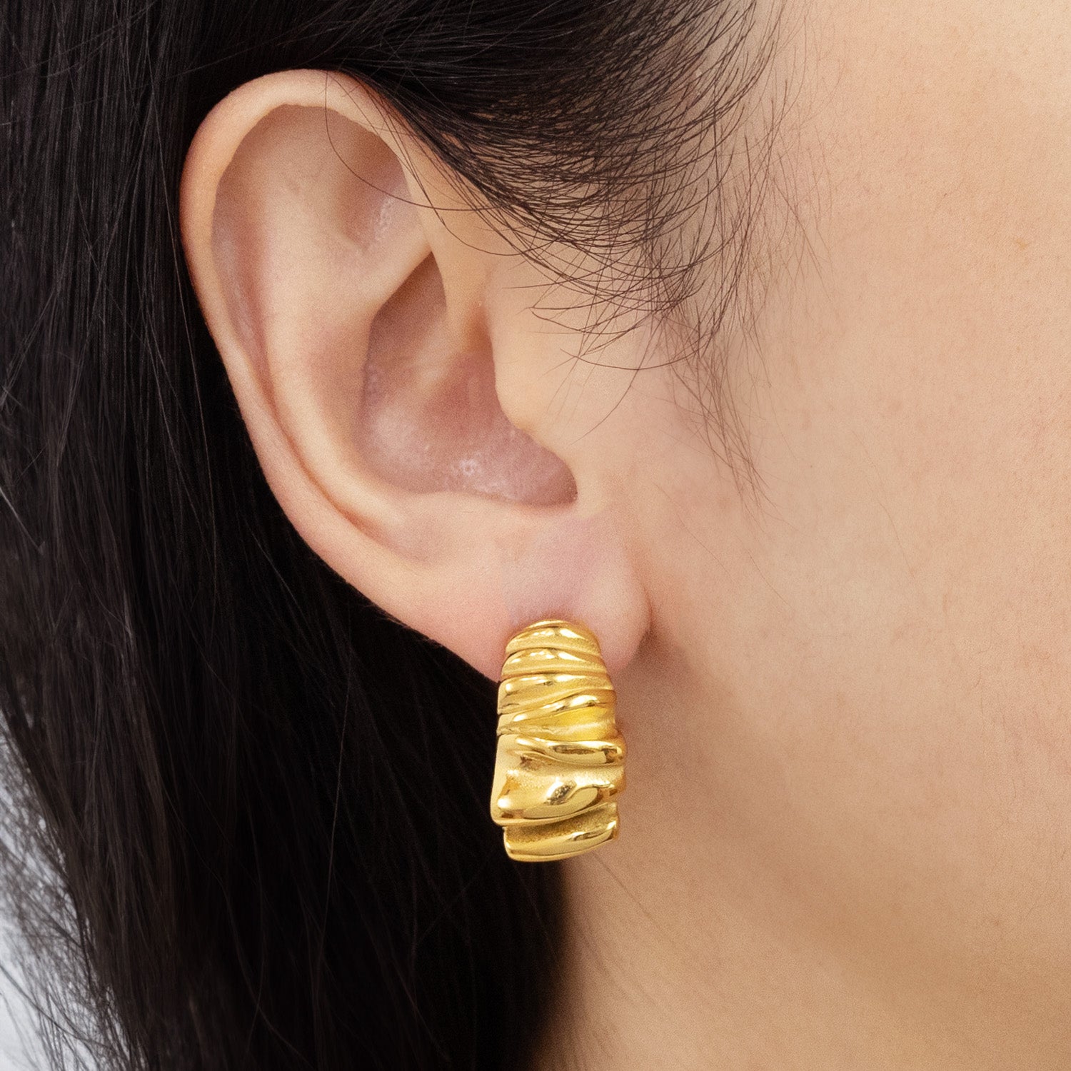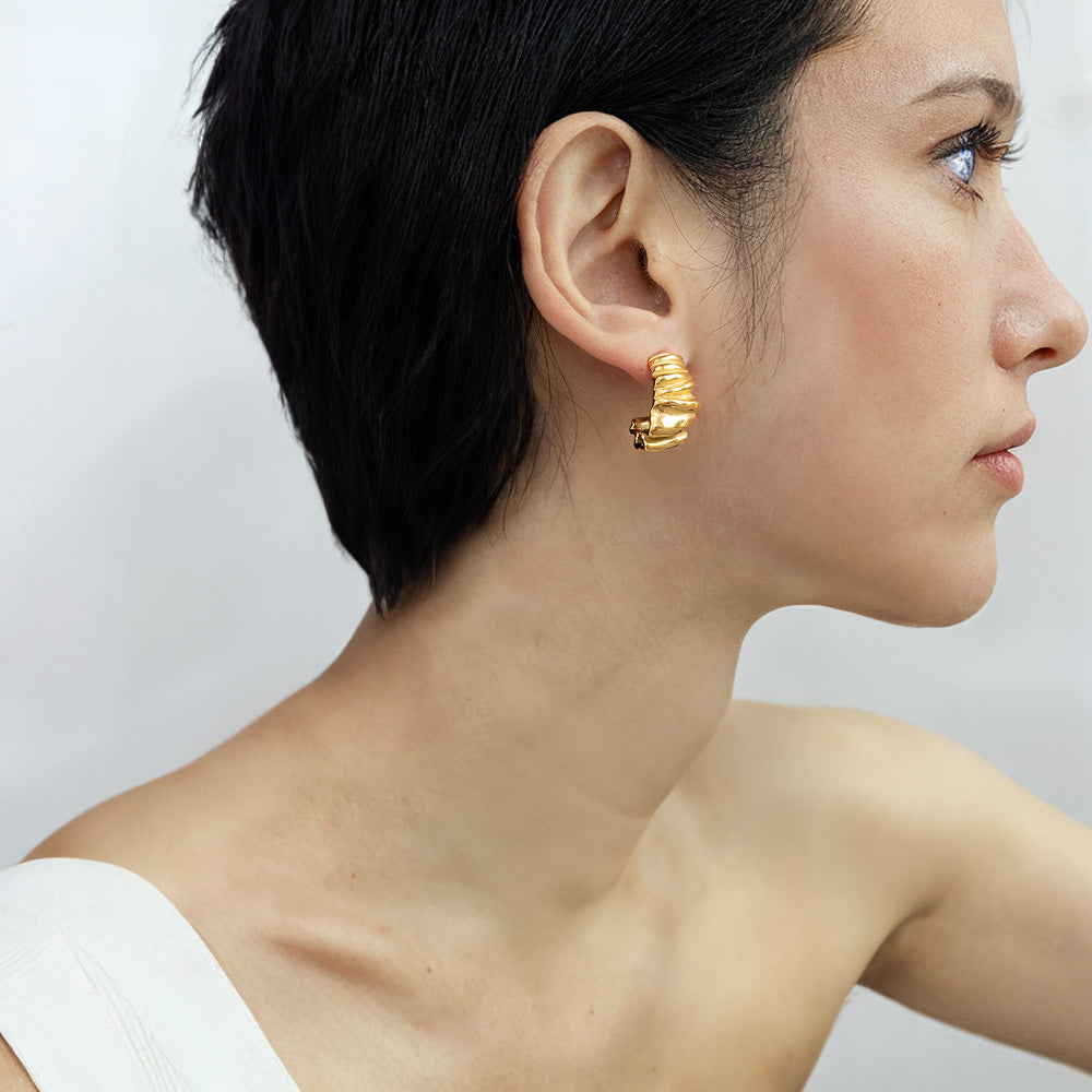 這款耳針將陽光在水面上搖曳生輝的波紋,以立體的形式展現,並選用合金鋼鍍金工藝的精緻耳針,金色光澤溫潤而持久,如同藝術界矚目的開場,預示著風格與優雅的序曲。