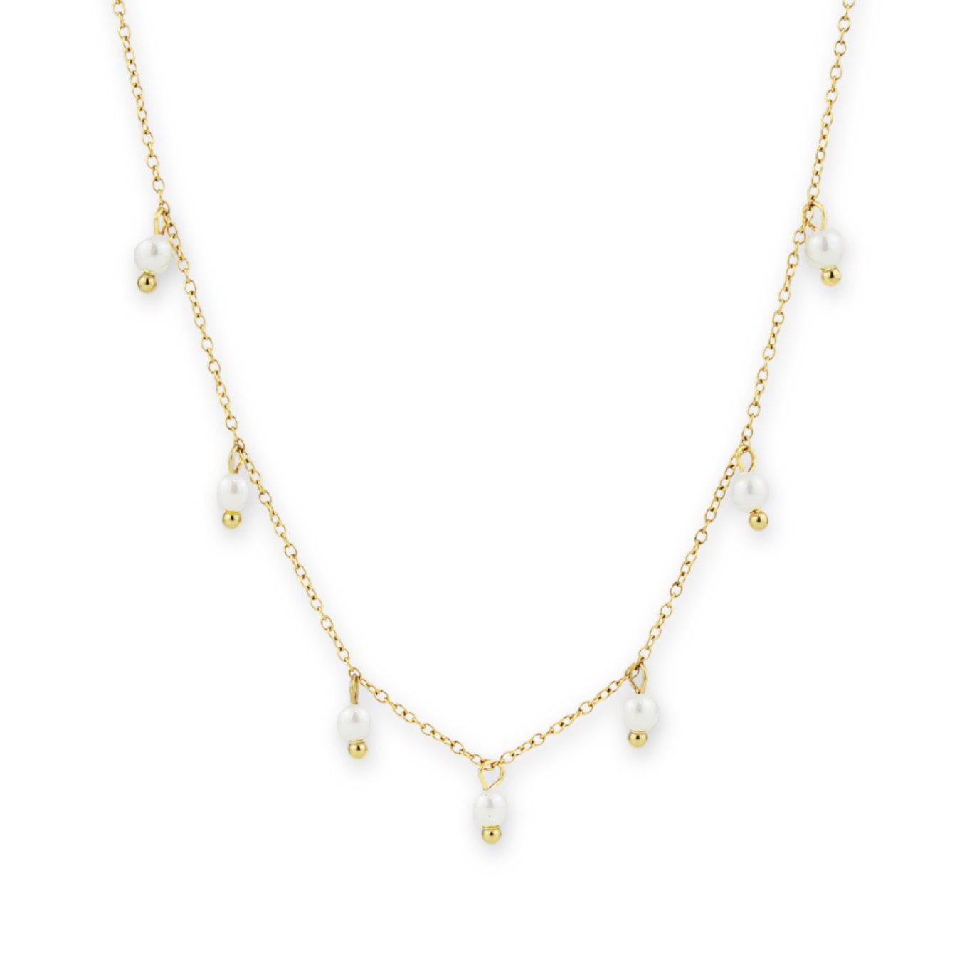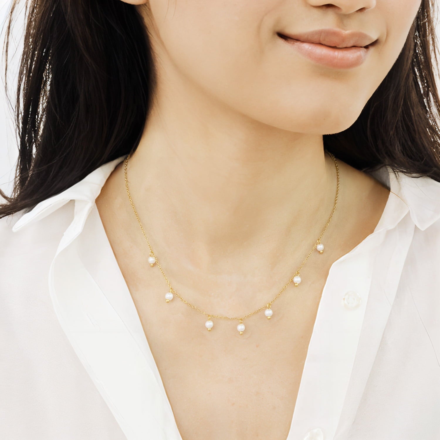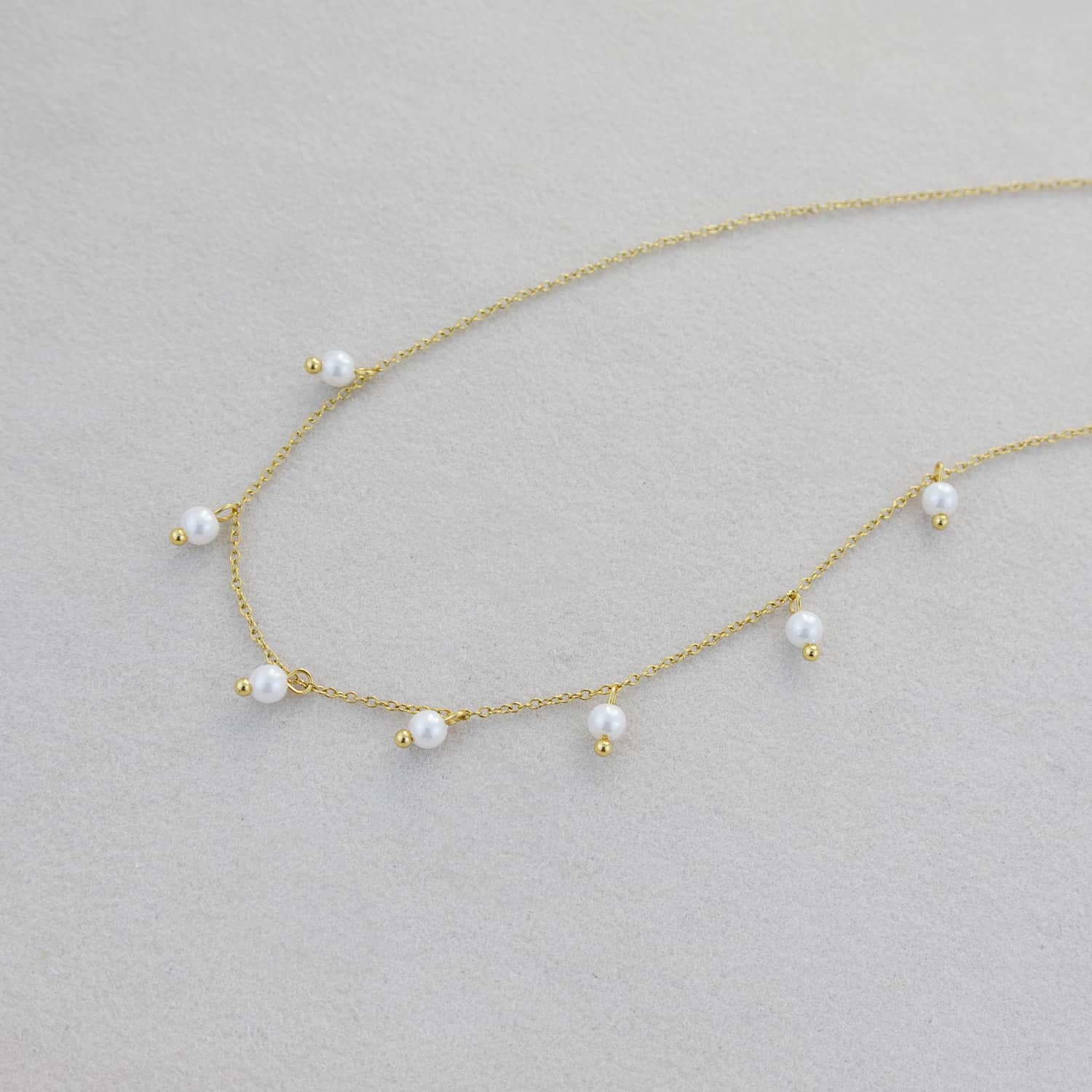 多顆珍珠如同雨後初露的水珠,散落在纖細金鍊上,閃耀著自然光澤。每顆珍珠的垂墜,隨著移動顯露不經意間的風情。適合所有追求細膩生活之美的女性。