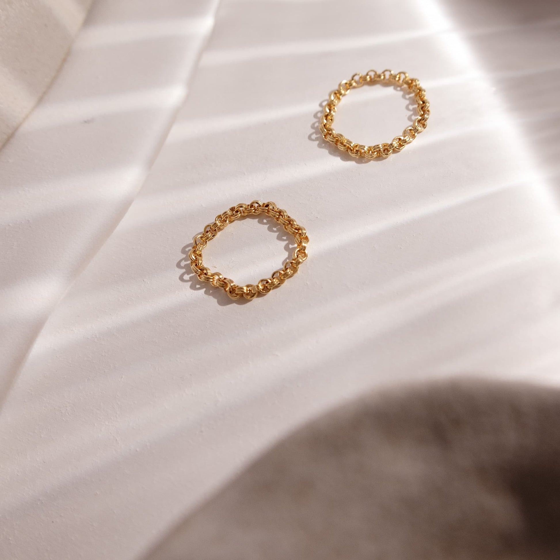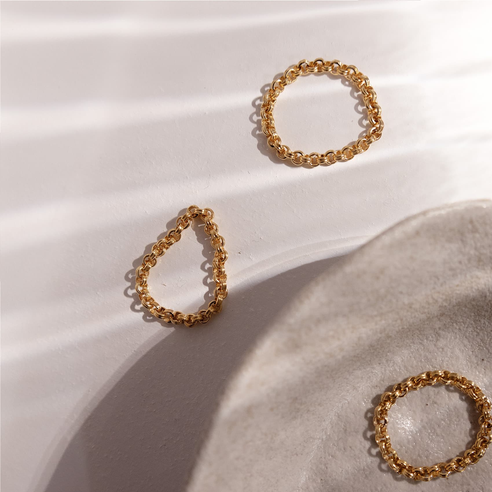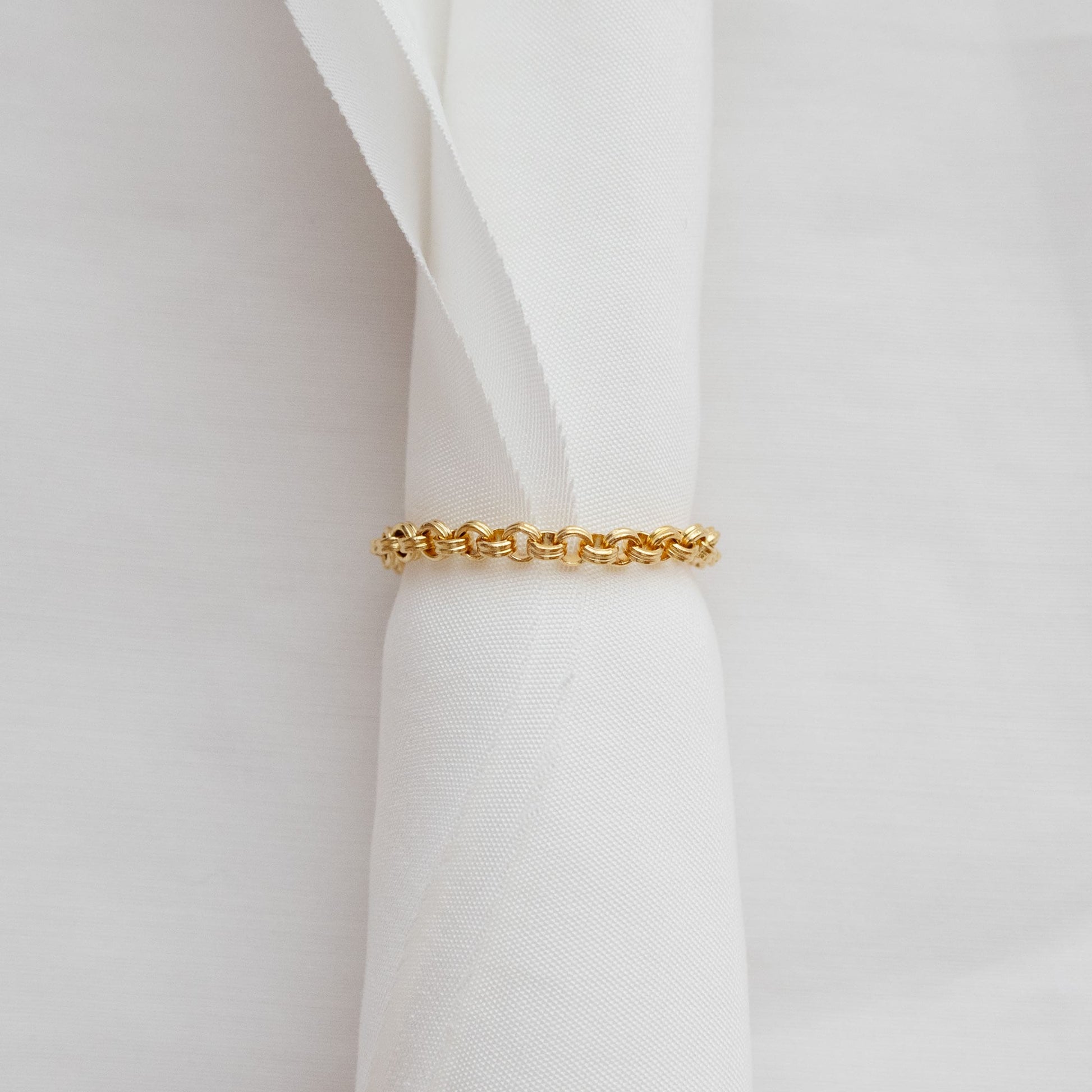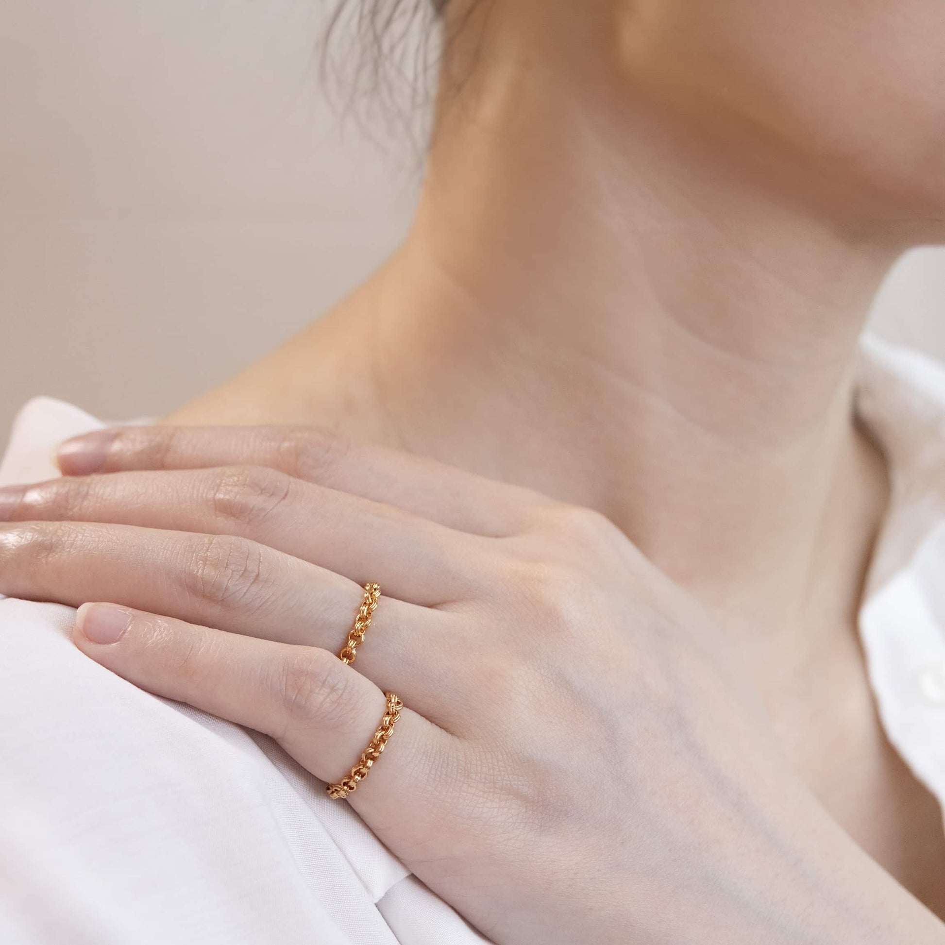 雙釦環鍊戒,一件簡單雋永的作品。採用裹金,如同其名,以一層堅固的黃金金屬將珠寶表面包裹,不僅擁有真實K金的溫暖光澤,也顯著提升了其耐用性和抗磨損能力。